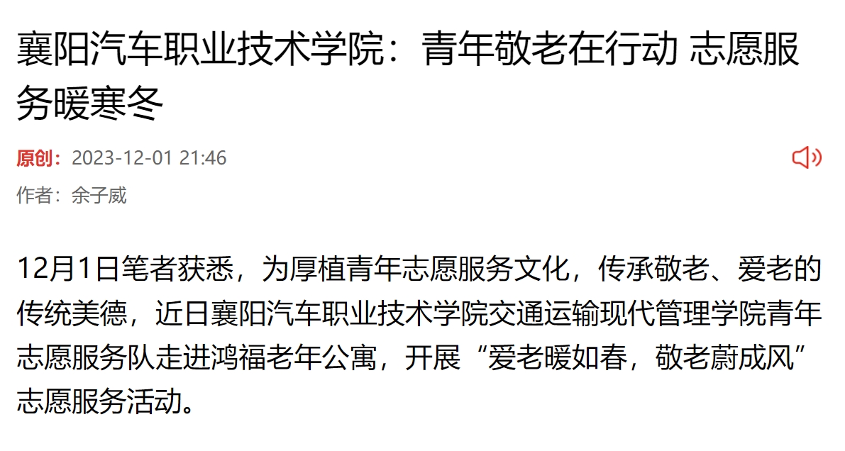 12月1日笔者获悉,为厚植青年志愿服务文化,传承敬老、爱老的传统美德,近日襄阳汽车职业技术学院交通运输现代管理学院青年志愿服务队走进鸿福老年公寓,开展“爱老暖如春,敬老蔚成风”志愿服务活动。