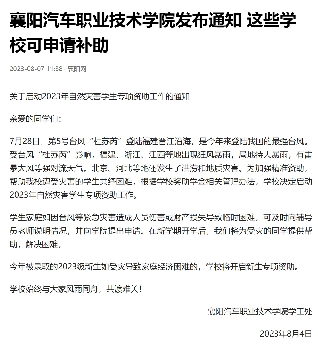 7月28日,第5号台风“杜苏芮”登陆福建晋江沿海,是今年来登陆我国的最强台风。受台风“杜苏芮”影响,福建、浙江、江西等地出现狂风暴雨,局地特大暴雨,有雷暴大风等强对流天气。北京、河北等地还发生了洪涝和地质灾害。为加强精准资助,帮助我校遭受灾害的学生共纾困难,根据学校奖助学金相关管理办法,学校决定启动2023年自然灾害学生专项资助工作。