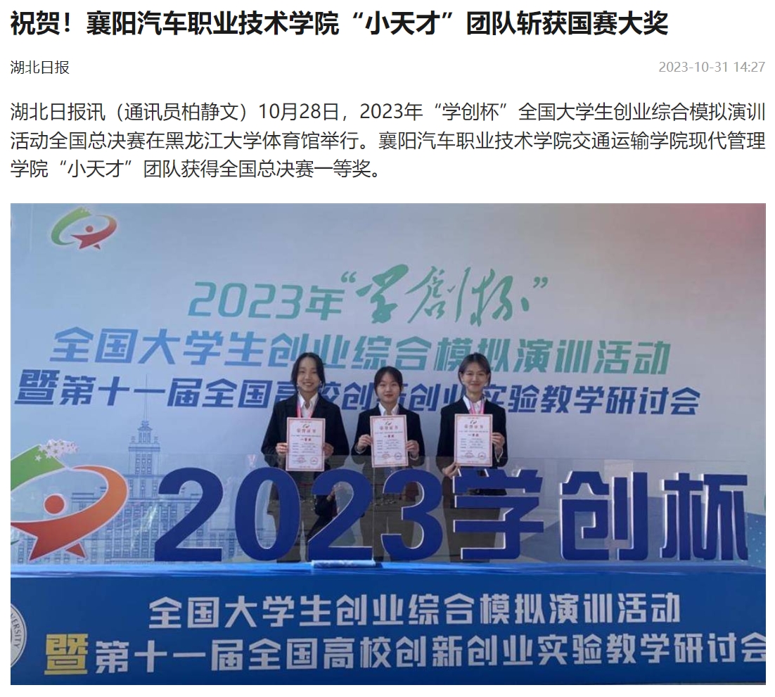 湖北日报讯(通讯员柏静文)10月28日,2023年“学创杯”全国大学生创业综合模拟演训活动全国总决赛在黑龙江大学体育馆举行。襄阳汽车职业技术学院交通运输学院现代管理学院“小天才”团队获得全国总决赛一等奖。