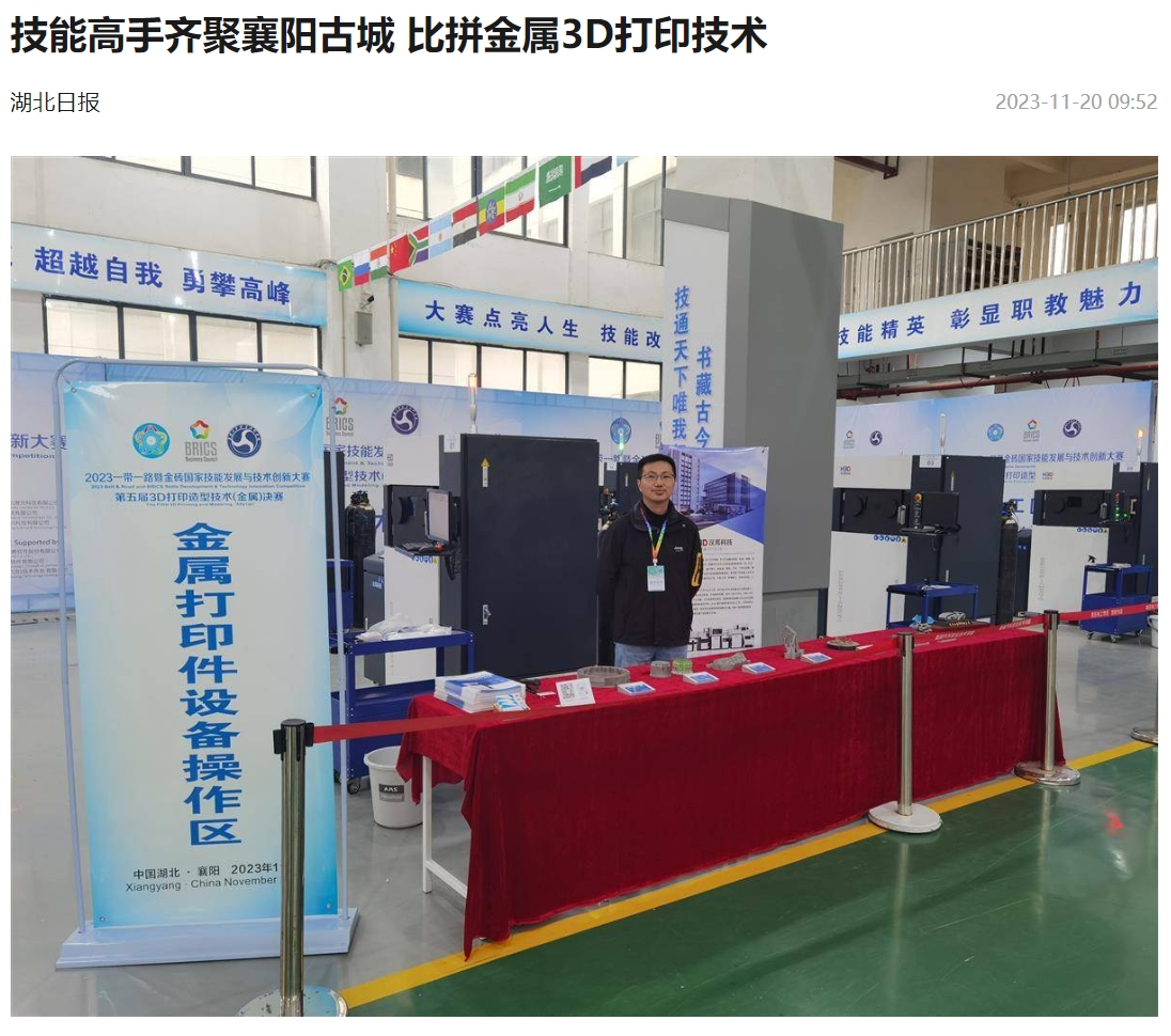 湖北日报讯(记者褚楠、通讯员易杰)11月15日至18日,2023“一带一路”暨金砖国家技能发展与技术创新大赛第五届3D打印造型技术(金属)决赛,在襄阳汽车职业技术学院举行。这也是襄阳首次举办金属3D打印领域职业技能大赛。