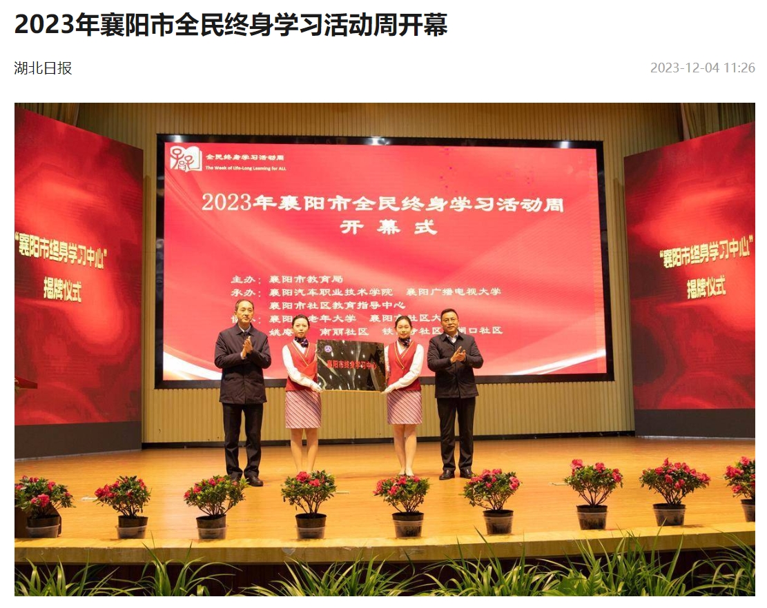 湖北日报讯(通讯员陈得帅、孙玉曼)11月28日上午,2023年襄阳市全民终身学习活动周在襄阳汽车职业技术学院开幕。