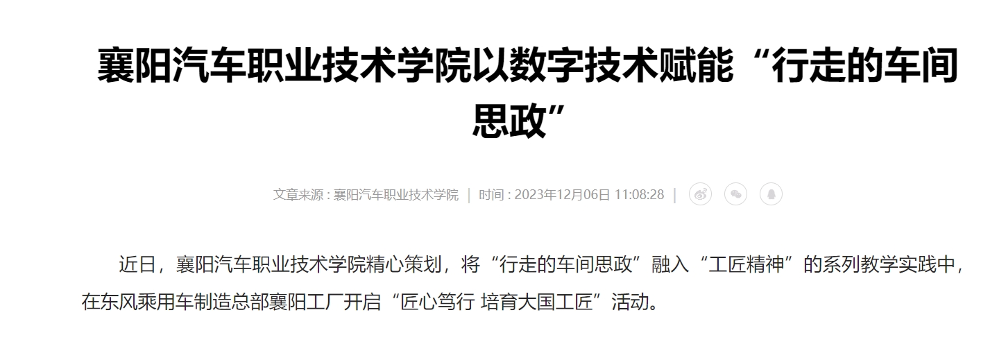 近日,襄阳汽车职业技术学院精心策划,将“行走的车间思政”融入“工匠精神”的系列教学实践中,在东风乘用车制造总部襄阳工厂开启“匠心笃行 培育大国工匠”活动。