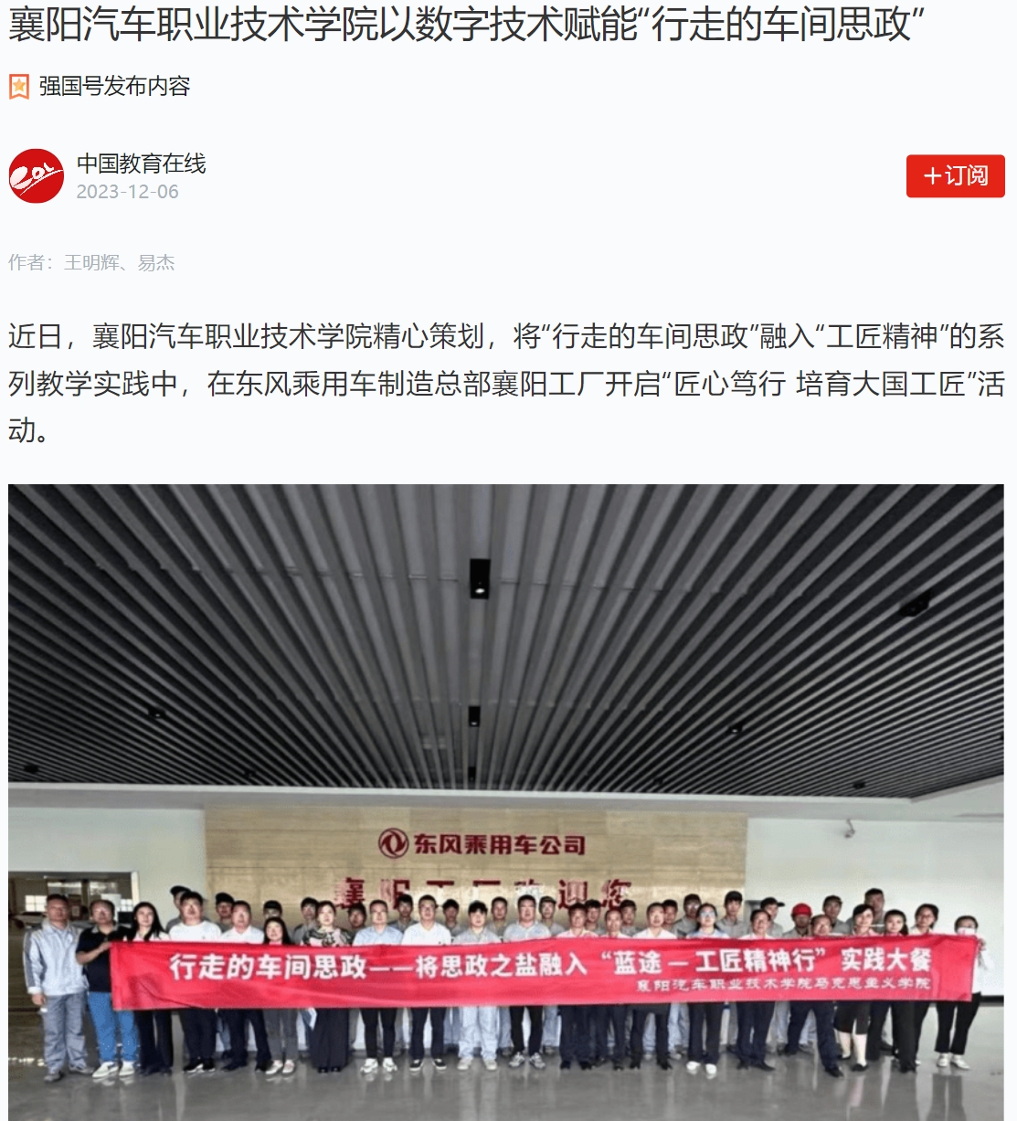 近日,襄阳汽车职业技术学院精心策划,将“行走的车间思政”融入“工匠精神”的系列教学实践中,在东风乘用车制造总部襄阳工厂开启“匠心笃行 培育大国工匠”活动。