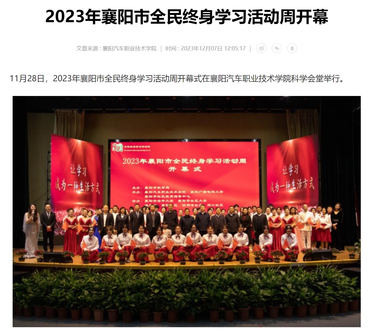 11月28日,2023年襄阳市全民终身学习活动周开幕式在襄阳汽车职业技术学院科学会堂举行。