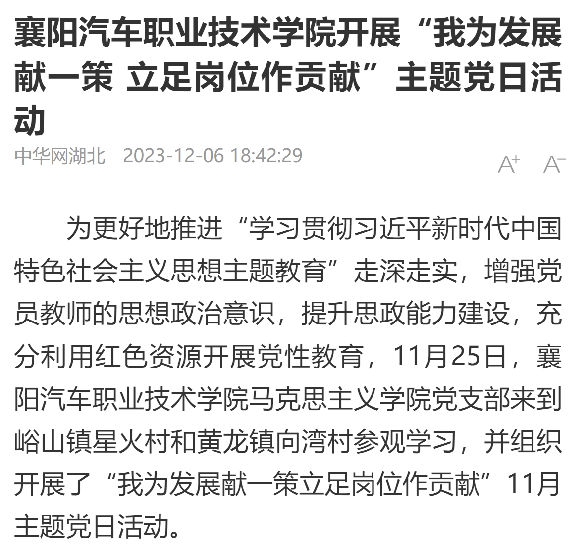 为更好地推进“学习贯彻习近平新时代中国特色社会主义思想主题教育”走深走实,增强党员教师的思想政治意识,提升思政能力建设,充分利用红色资源开展党性教育,11月25日,襄阳汽车职业技术学院马克思主义学院党支部来到峪山镇星火村和黄龙镇向湾村参观学习,并组织开展了“我为发展献一策立足岗位作贡献”11月主题党日活动。