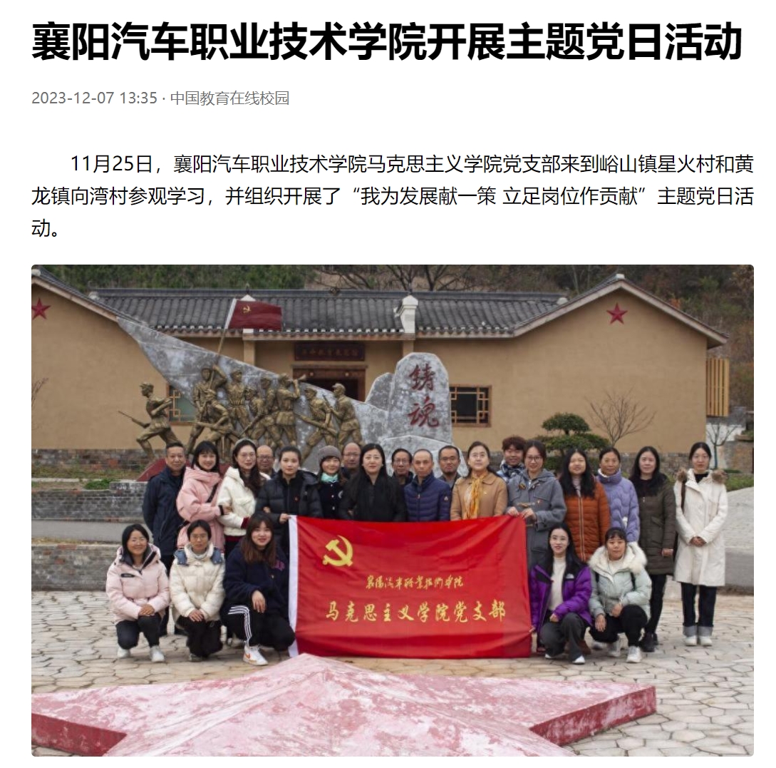 11月25日,襄阳汽车职业技术学院马克思主义学院党支部来到峪山镇星火村和黄龙镇向湾村参观学习,并组织开展了“我为发展献一策 立足岗位作贡献”主题党日活动。