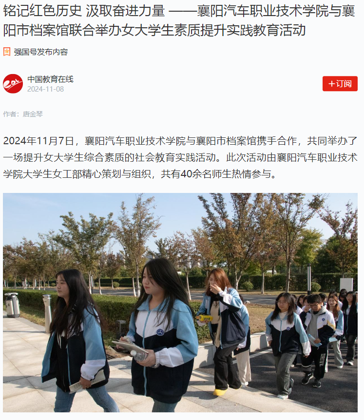 同时,襄阳汽车职业技术学院大学生女工部也将继续加强与襄阳市档案馆等单位的合作与交流,为女大学生们提供更多元、更优质的学习和实践平台,助力她们全面成长成才。