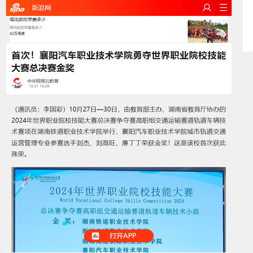 10月27日—30日,由教育部主办、湖南省教育厅协办的2024年世界职业院校技能大赛总决赛争夺赛高职组交通运输赛道轨道车辆技术赛项在湖南铁道职业技术学院举行,襄阳汽车职业技术学院城市轨道交通运营管理专业参赛选手刘杰、刘高旺、廉丁丁荣获金奖!这是该校首次获此殊荣。