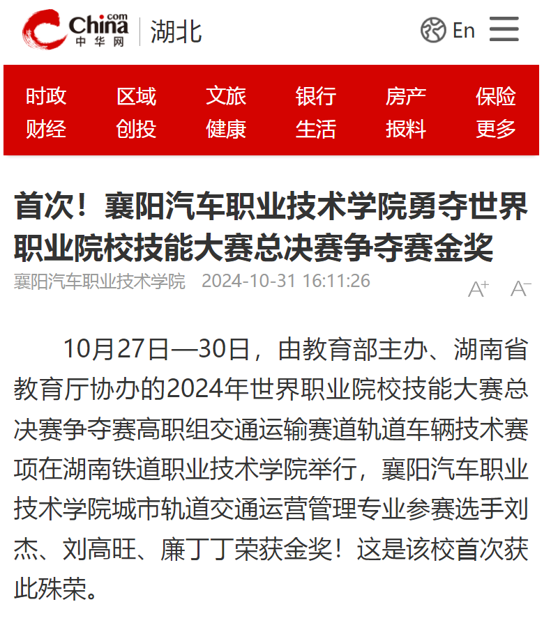 10月27日—30日,由教育部主办、湖南省教育厅协办的2024年世界职业院校技能大赛总决赛争夺赛高职组交通运输赛道轨道车辆技术赛项在湖南铁道职业技术学院举行,襄阳汽车职业技术学院城市轨道交通运营管理专业参赛选手刘杰、刘高旺、廉丁丁荣获金奖!这是该校首次获此殊荣。