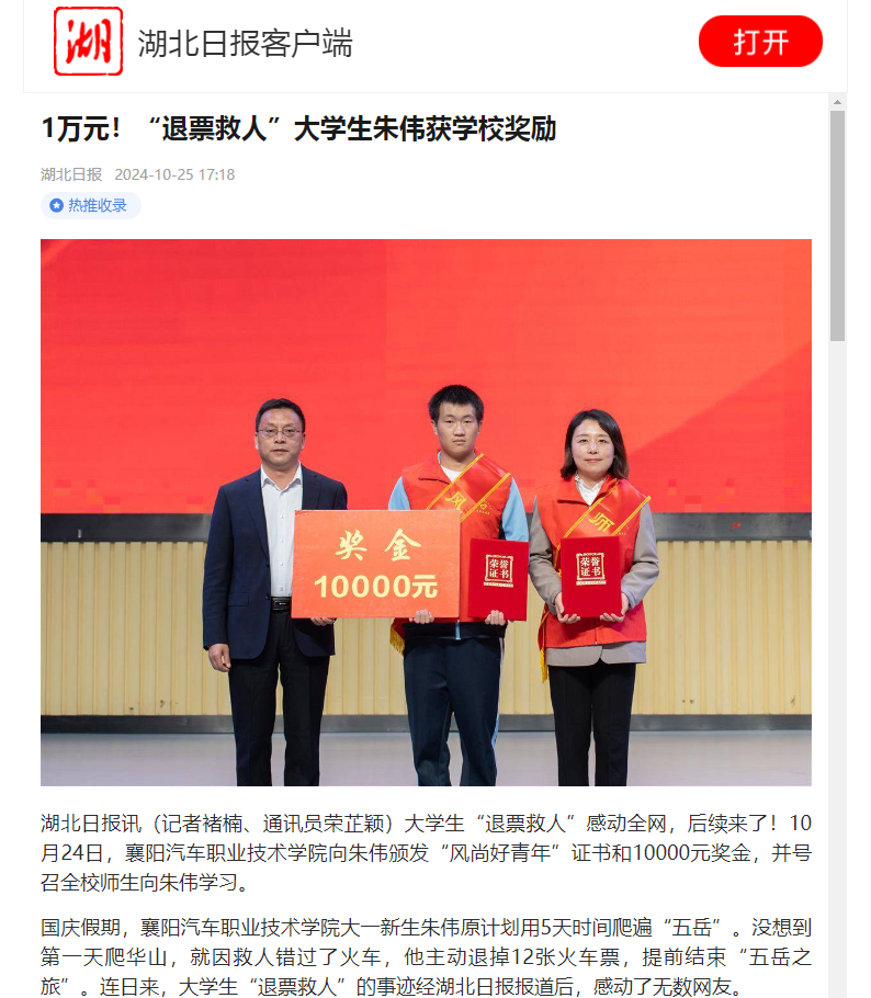 《湖北日报》1万元!“退票救人”大学生朱伟获学校奖励