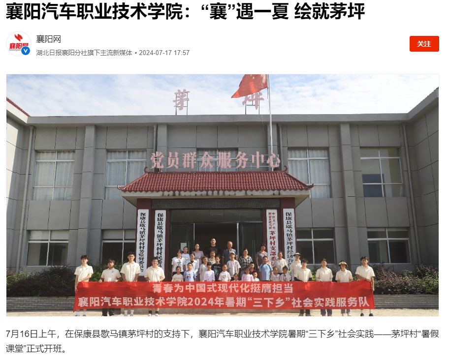 7月16日上午,在保康县歇马镇茅坪村的支持下,襄阳汽车职业技术学院暑期“三下乡”社会实践——茅坪村“暑假课堂”正式开班。