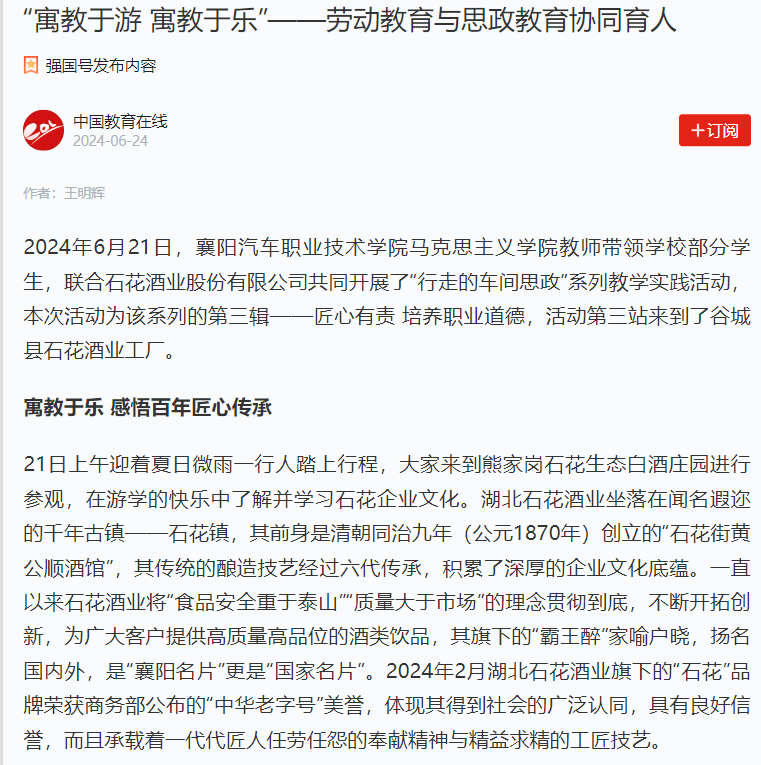 2024年6月21日,襄阳汽车职业技术学院马克思主义学院教师带领学校部分学生,联合石花酒业股份有限公司共同开展了“行走的车间思政”系列教学实践活动,本次活动为该系列的第三辑——匠心有责 培养职业道德,活动第三站来到了谷城县石花酒业工厂。