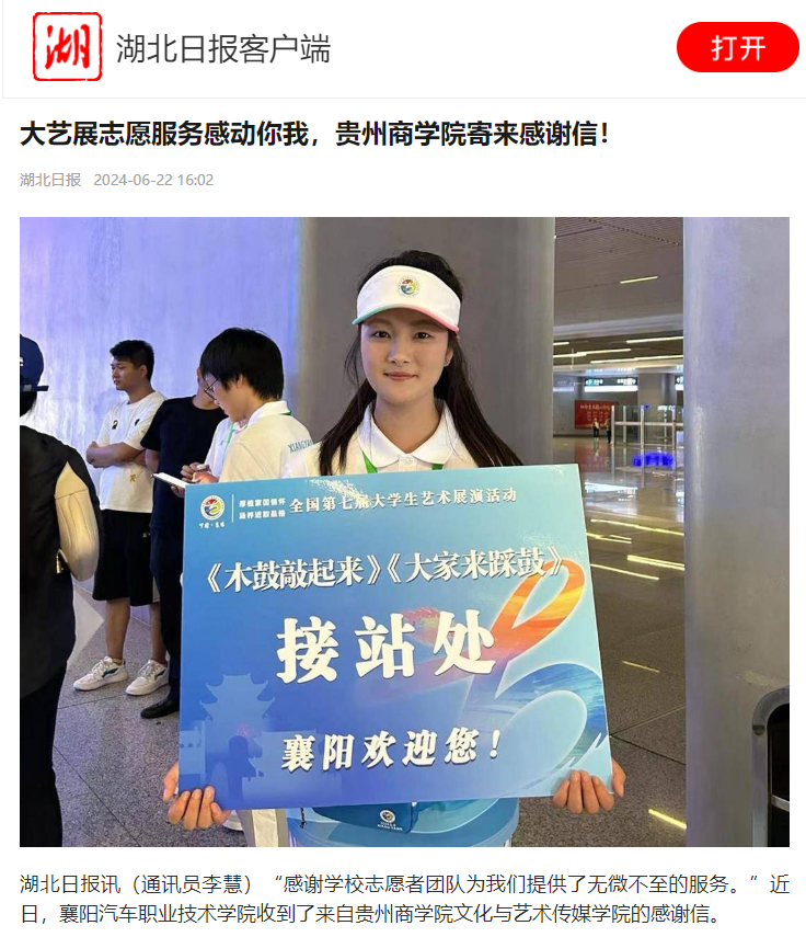 “感谢学校志愿者团队为我们提供了无微不至的服务。”近日,襄阳汽车职业技术学院收到了来自贵州商学院文化与艺术传媒学院的感谢信。