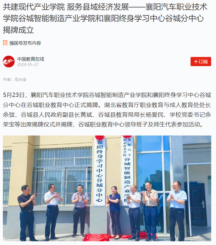 5月23日,襄阳汽车职业技术学院谷城智能制造产业学院和襄阳终身学习中心谷城分中心在谷城职业教育中心正式揭牌。湖北省教育厅职业教育与成人教育处处长余弢、谷城县人民政府副县长黄斌、谷城县教育局局长杨爱民、学校党委书记余荣宝等出席揭牌仪式并揭牌,谷城职业教育中心领导班子及师生代表参加活动。