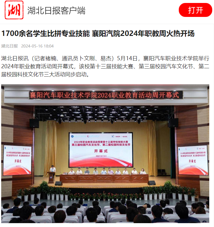 5月14日,襄阳汽车职业技术学院举行2024年职业教育活动周开幕式,该校第十三届技能大赛、第三届校园汽车文化节、第二届校园科技文化节三大活动同步启动。