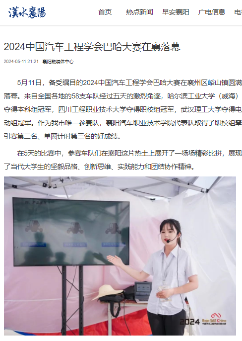 5月11日,备受瞩目的2024中国汽车工程学会巴哈大赛在襄州区峪山镇圆满落幕。来自全国各地的58支车队经过五天的激烈角逐,哈尔滨工业大学(威海)夺得本科组冠军,四川工程职业技术大学夺得职校组冠军,武汉理工大学夺得电动组冠军。作为我市唯一参赛队,襄阳汽车职业技术学院代表队取得了职校组牵引赛第二名、单圈计时第三名的好成绩。