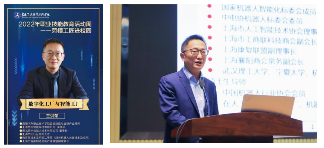 今年职业教育活动周是新修订的《职业教育法》正式施行后的第一个活动周,为深入贯彻2022年“职业教育活动周”的精神,弘扬劳模精神,拓展学生视野,5月9日,我校特邀请上海贽匠智能科技有限公司、湖北贽丰机器人技术有限公司董事长、襄阳汽车职业技术学院智能制造专业群产业导师王洪荣,开展了《数字化工厂与智能工厂》专题讲座。