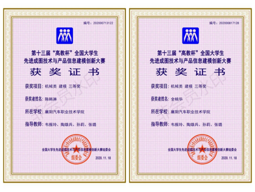 2020年11月13日至18日,第十三届“高教杯”全国大学生先进成图大赛在线上线下拉开帷幕,我校智能制造学院学子全桃华、陈韩淋继2018年后再次双双喜获机械类建模赛项三等奖。
