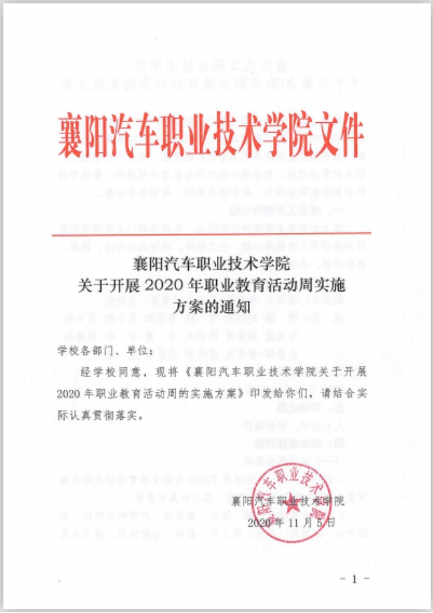 襄阳汽车职业技术学院关于开展2020年职业教育活动周实施方案的通知