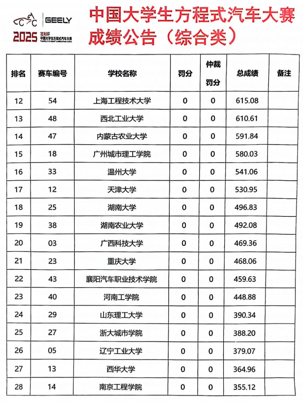 10月12日,由中国科学技术协会指导、中国汽车工程学会与郑州市人民政府联合主办的2025中国大学生方程式汽车大赛在河南郑州圆满落幕。我校梦启方程式赛车队凭借扎实的专业实力与顽强的拼搏精神,以总分排名第22位的优异成绩,斩获全国二等奖。