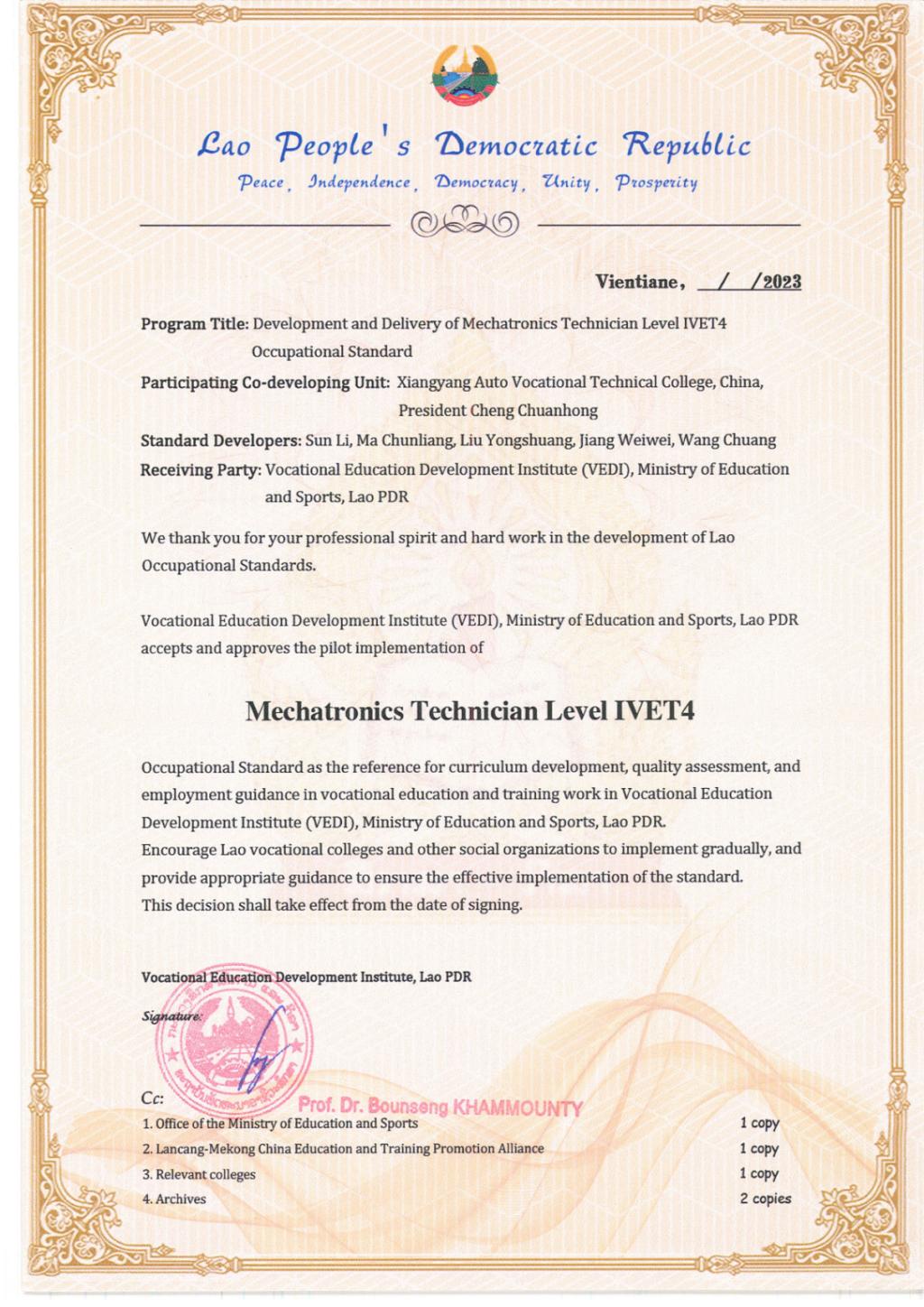 近日,从老挝教育与体育部职业教育发展研究院获悉,由我校教师孙莉、马春亮、刘永双、江薇薇、王闯主导制定的“机电一体化技术员IVET4级”标准纳入老挝国家职业教育标准体系。