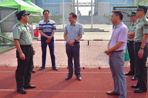 (通讯员:沈晨)9月14日,2017级新生军训如火如荼地进行。院长宋清龙,副院长程传红,承训单位陆军勤务学院训练基地副主任周保津,训练处副处长黎明,勤务系主任李新春等在学工处、保卫处等相关部门领导的陪同下,亲临运动场看望慰问教官及参加军训的2017级新生。