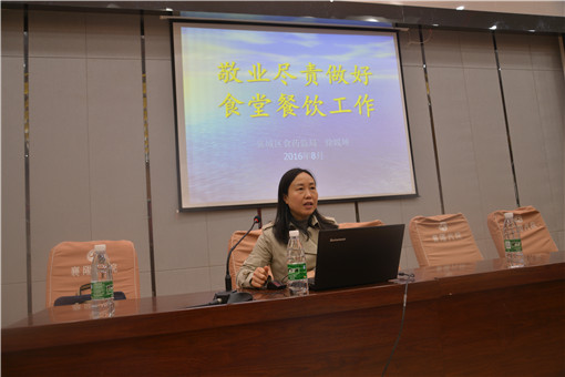 培训会由襄城区食品药品监督管理局徐媛坤科长主讲,徐科长从食堂机构设置、食堂从业人员管理(包括食品安全管理人员基本要求、从业人员健康管理要求、从业人员个人卫生要求)、食堂餐饮制作操作流程、信息报告等四个方面作了详细的讲解。
