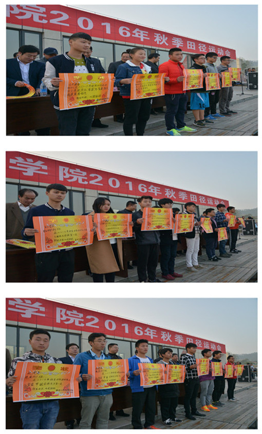 闭幕式上,总裁判长王国斌同志宣布本次田径运动会的获奖名单后,学院领导分别为获奖班级和个人颁奖。 党委书记许云为本次运动会闭幕式致词,他指出:此次运动会各项比赛在紧张、激烈、有序中顺利进行,在比赛的过程中无论是裁判员还是运动员,无论是教职工还是学生都表现出了集体的团队凝聚力和积极向上的拼搏精神,希望大家在以后的工作和学习中能克服困难,继续传承奥林匹克精神,为学院的发展共同奋斗。(摄影:大学生记者 叶勋、王艳琦、曹智翔)