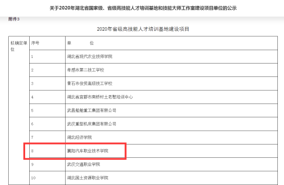 近日,省人社厅发布《关于2020年湖北省国家级、省级高技能人才培训基地和技能大师工作室建设项目单位的公示》,我校申报的“2020年省级高技能人才培训基地建设项目”,经过襄阳市人民政府、襄阳市人社局推荐,省人社厅组织专家评审,现已通过,该项目全省仅10个。