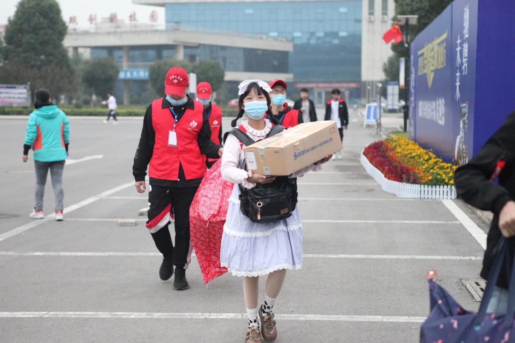 迎新现场,志愿者们热心帮助新生抬运行李,为新生引路,协助新生完成体温测量、身份核查、报到注册、领取材料及生活物品等工作。
