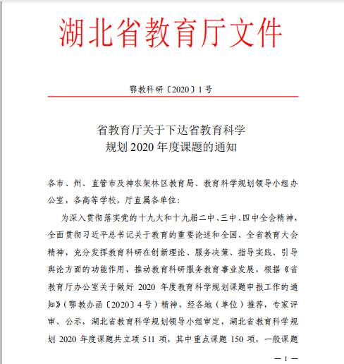 根据《省教育厅关于下达省教育科学规划2020年度课题的通知》(鄂教科研〔2020〕1号)精神,我校共有3项课题获得立项。