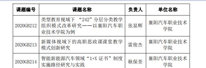 经各地(单位)推荐,专家评审、公示,湖北省教育科学规划领导小组审定,我校党委副书记、院长耿保荃的《智能新能源汽车领域“1+X证书”制度实践路径研究与实践》(2020GB214),交通运输学院院长张显辉的《类型教育视域下“242”分层分类教学组织模式改革研究——以襄阳汽车职业技术学院为例》(2020GB212)、马克思主义学院书记雷俊杰的《新媒体视域下的高职思政课课堂教学模式创新研究》(2020GB213)喜获立项。