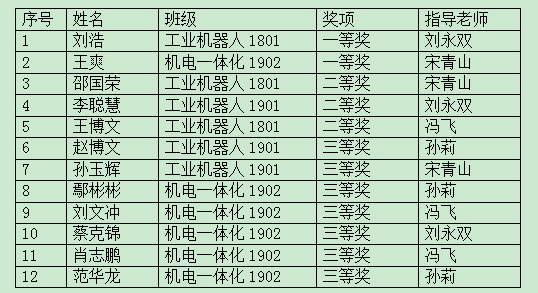 本次大赛历时3个月,共有来自全国210家职业院校的1082名选手参赛。我校选派工业机器人技术专业、机电技术专业18、19级刘浩等12名选手参赛,共获一等奖2项、二等奖3项、三等奖7项。同时,孙莉、刘永双、冯飞、宋青山获赛项“优秀指导教师”称号。