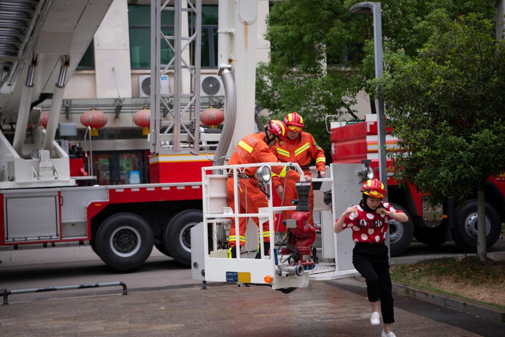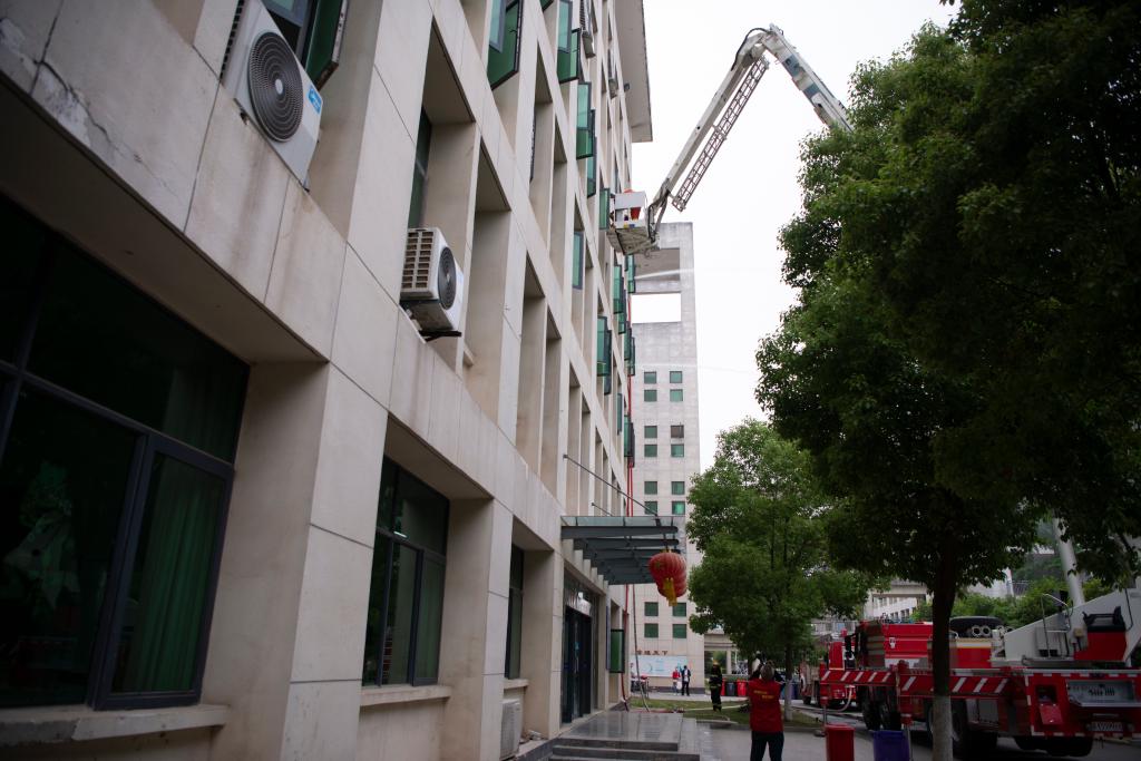火灾救援演练中,利用消防车消灭起火点,解救被困者,对其进行心肺复苏。