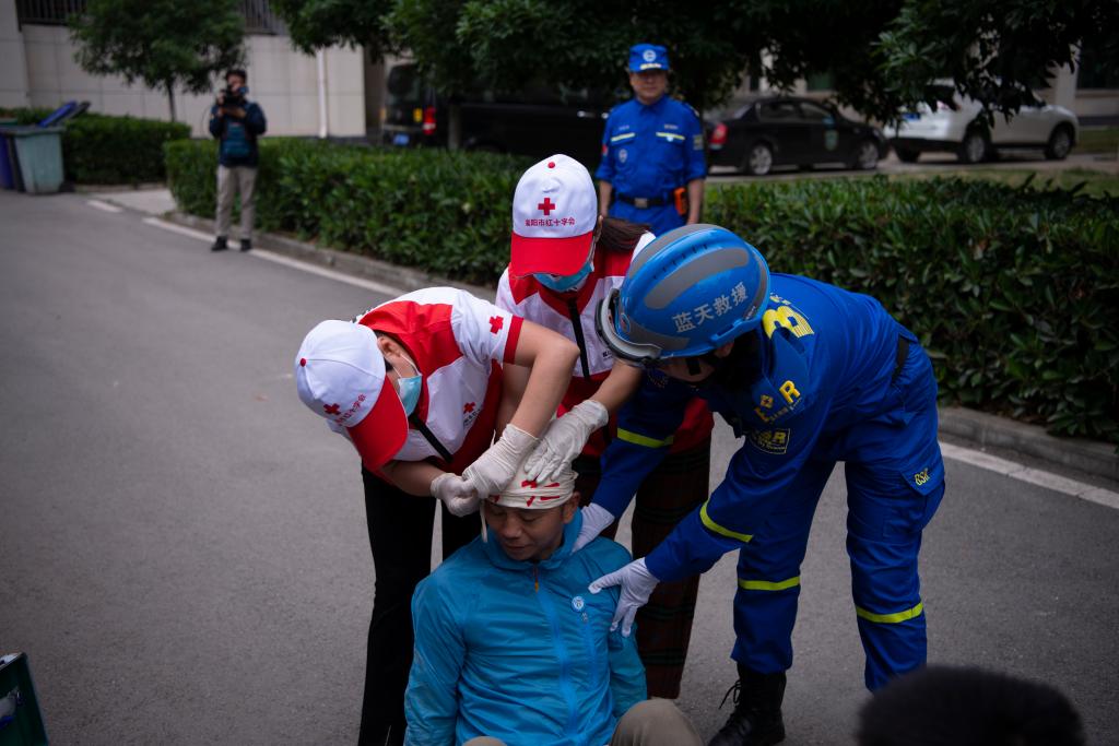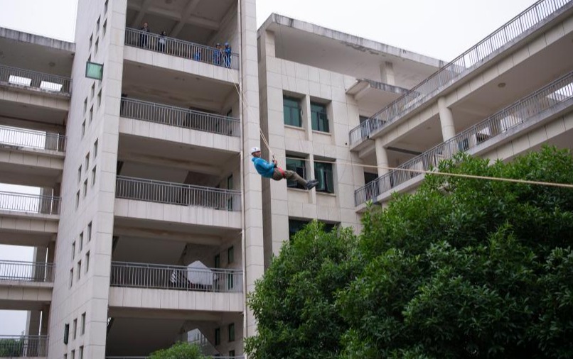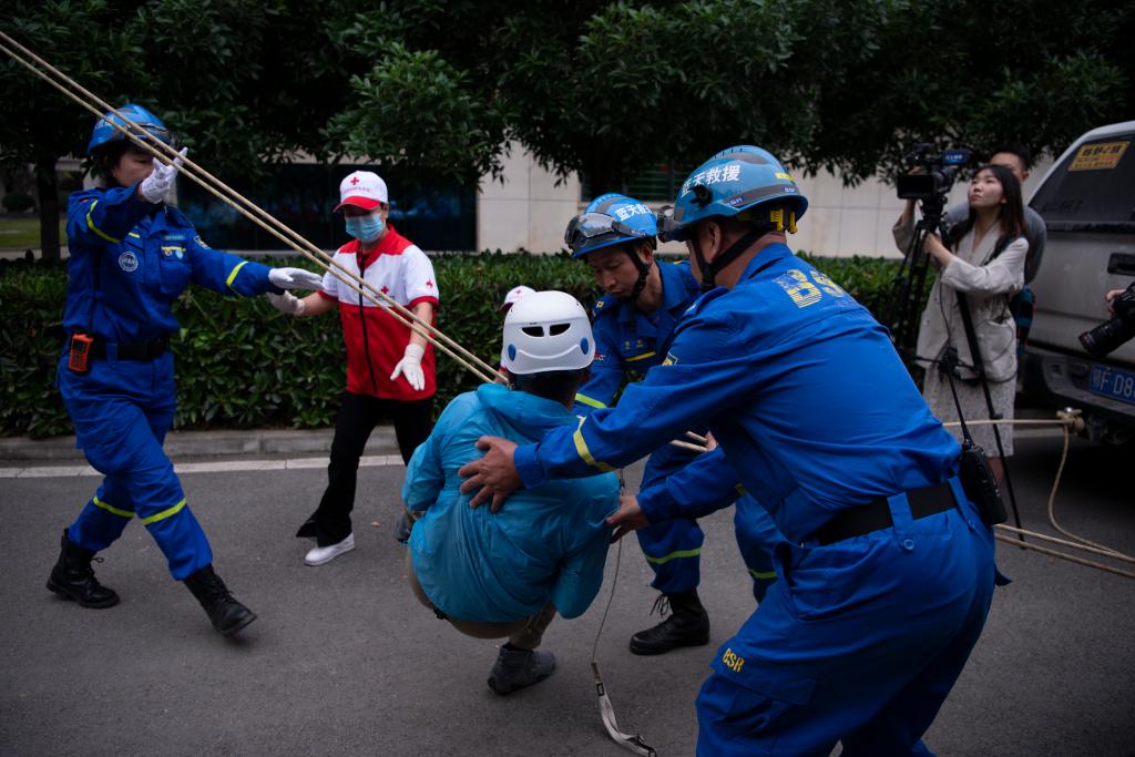 应急救援演练中,救援队通过绳索索降的方式解救被困人员,再对被困者进行紧急包扎止血。