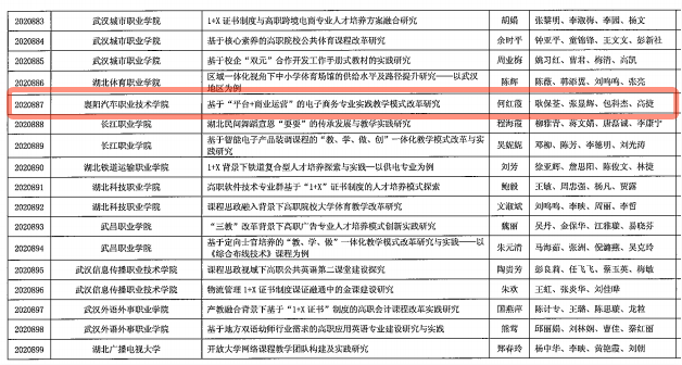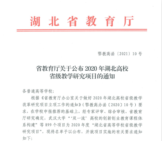 近日,湖北省教育厅下发《省教育厅关于公布2020年湖北高校省级教学研究项目的通知》(鄂教高函【2021】10号)文件。我校教师何红霞《基于“平台+商业运营”的电子商务专业实践教学模式改革研究》(2020887)喜获立项。