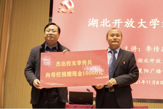 为了表达对母校的感激与回馈,李教授个人出资向学校捐款现金一万元。院长耿保荃代表学校接受捐赠,并向李教授颁发襄阳汽车职业技术学院客座教授证书。(摄影:大学生记者团)