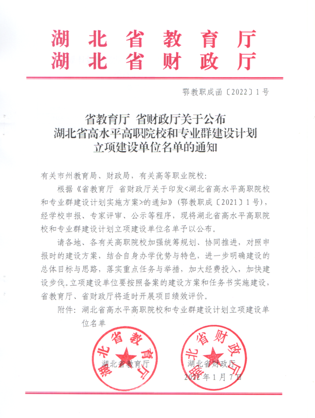 1月10日,湖北省教育厅、湖北省财政厅发布了《关于公布湖北省高水平高职院校和专业群建设计划立项建设单位名单的通知》,我校通过湖北省高水平高职院校立项。同时,智能新能源汽车专业群和智能制造与装备专业群立项为省级高水平专业群。