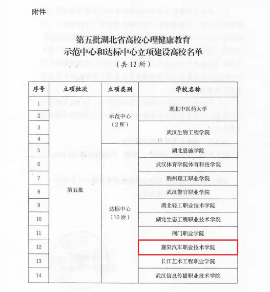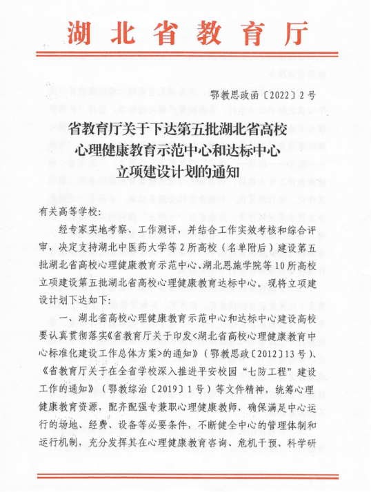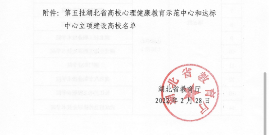 2月28日,湖北省教育厅发布了《关于下达第五批湖北省高校心理健康教育示范中心和达标中心立项建设计划的通知》,我校通过湖北省高校心理健康教育达标中心立项。