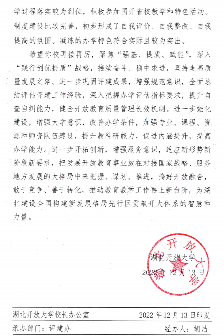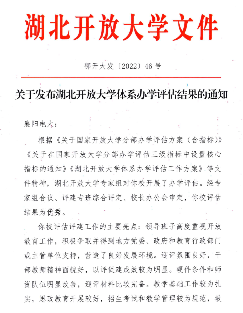 近期,湖北开放大学下发《关于发布湖北开放大学体系办学评估结果的通知》(鄂开大发〔2022〕46号),公布了全省办学评估结果。经专家组会议、评建专班综合评定、校长办公会审定,我校喜获湖北开放大学体系办学评估优秀等级。