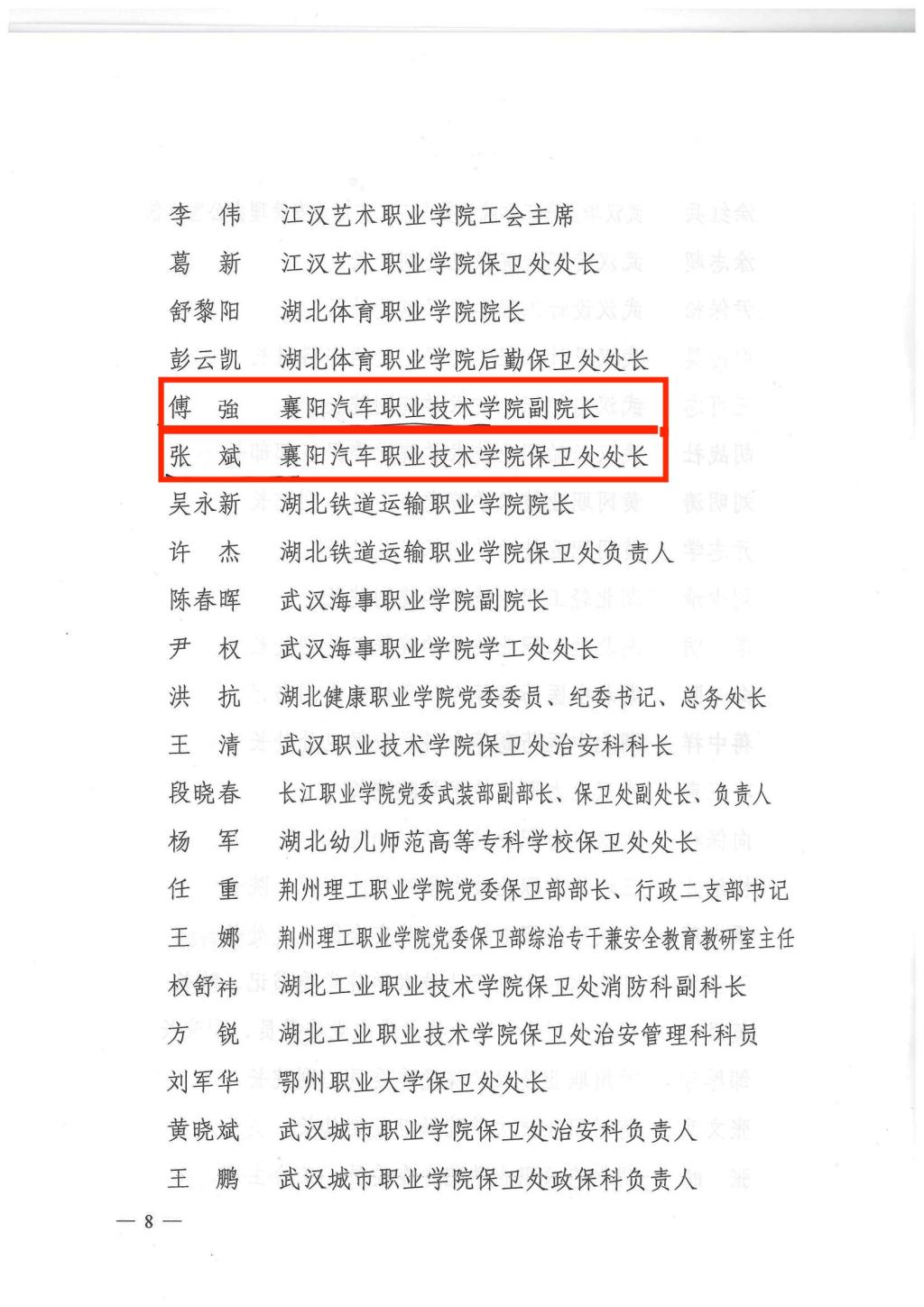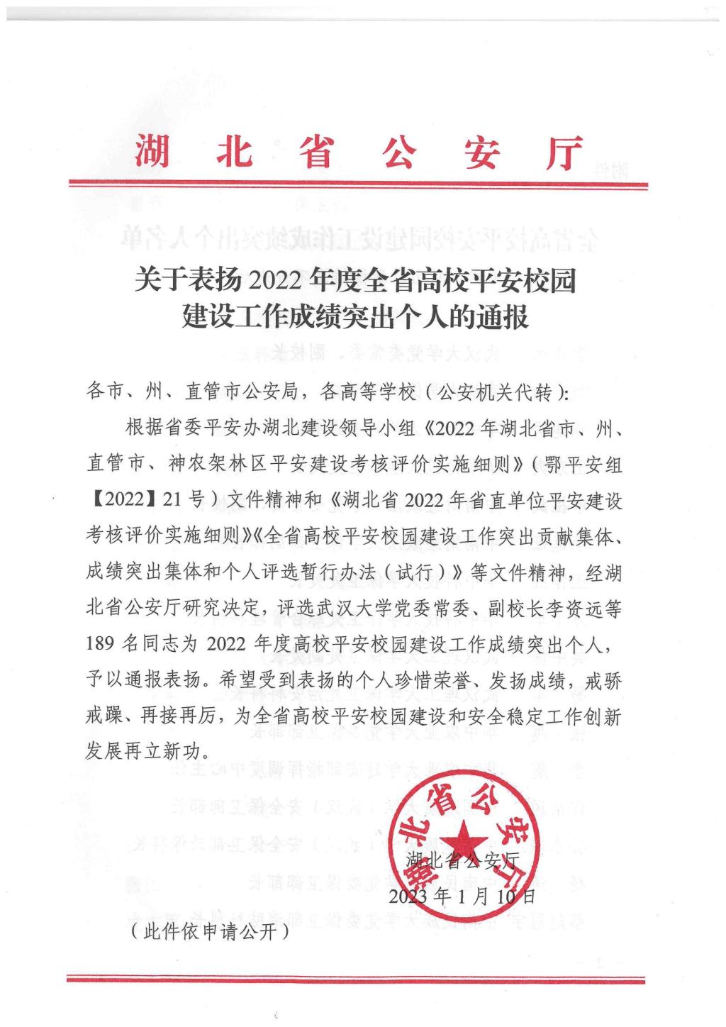 近日,湖北省公安厅印发《关于表扬2022年度全省高校平安校园建设工作成绩突出个人的通报》。我校傅强、张斌两位同志被评为“2022年度高校平安校园建设工作成绩突出个人”。