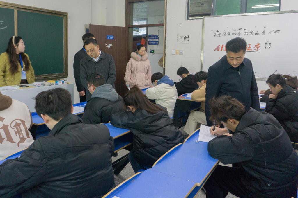 程传红指出,期末考试是学校教育教学工作的重要环节,是评估教学效果、质量的重要手段,也是检验教风、学风建设水平的试金石,要以考促学,以考促教,全面提升教学质量和管理水平。他要求,各二级学院要规范考试各环节工作,严格按照标准考场设置实施考试,一是抓好考风考纪,落实学生“双证”进考场的要求;二是要做好未返校学生后续考试安排;三是要结合学院实际情况,细化考试工作各项流程,精细化组织实施,保障考试工作平稳、高效、有序。(摄影:易杰)
