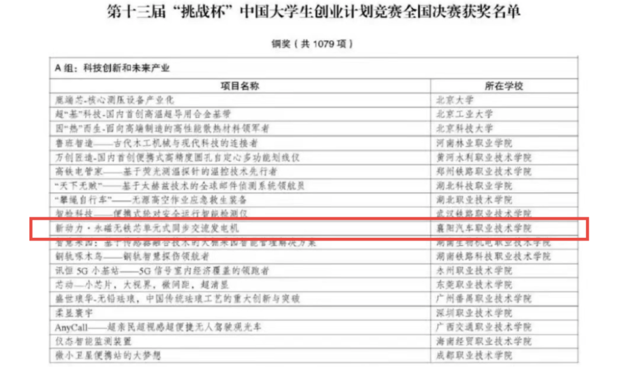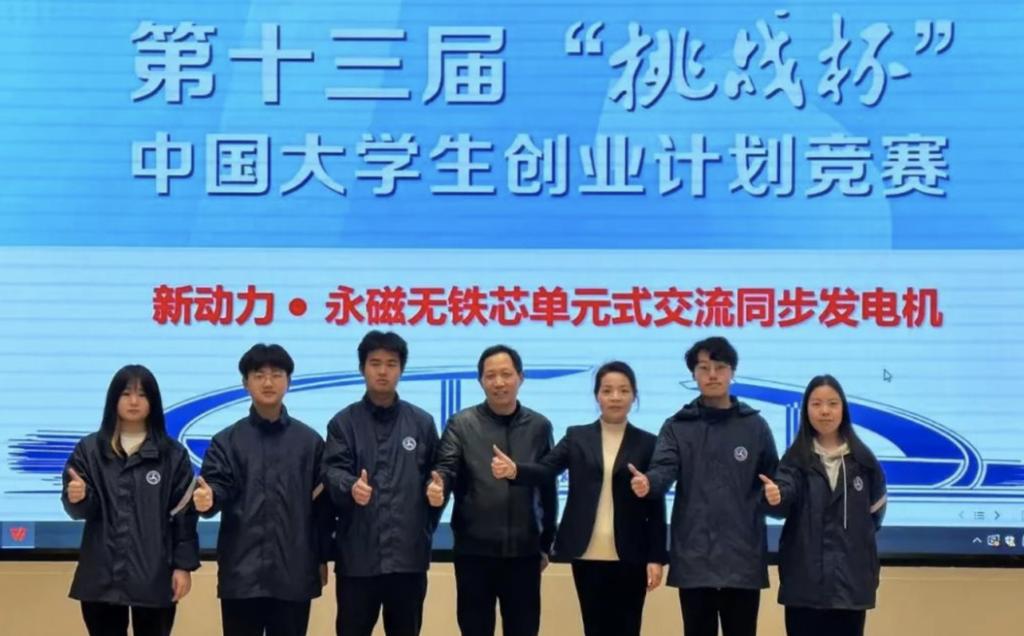 3月17日至19日,由共青团中央、教育部、人力资源社会保障部、中国科协、全国学联、北京市人民政府主办,北京理工大学、共青团北京市委、北京市房山区人民政府承办的第十三届“挑战杯”中国大学生创业计划竞赛全国决赛在北京举行。全国3011所高校142.4万名学生参赛,累计提交33万余个创新创业项目赛。我校智能制造学院参赛项目--“新动力.永磁无铁芯单元式交流同步发电机”获第十三届“挑战杯”中国大学生创业计划竞赛铜奖!取得了我校在该项赛事中的历史最佳成绩。
