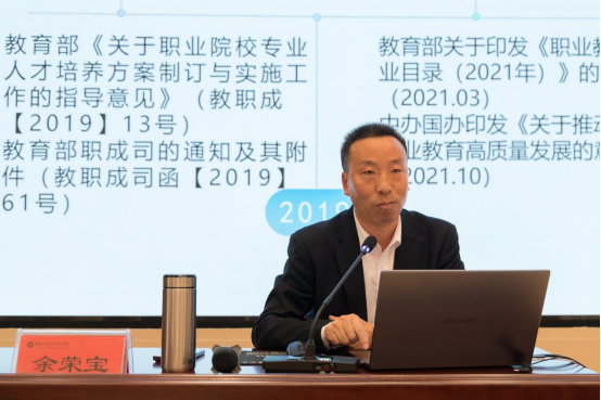 余荣宝教授以“类型教育导向下高职专业(群)人才培养方案研制思考与实践”为主题,从新时代职业教育理念变化分析、专业(群)人才培养方案研判的价值和专业(群)人才培养方案研制的关键三个维度进行系统阐释。强调宏观层面实现理念融合、技术融合、创新融合、人才融合以及平台融合;中观层面促进共赢机制的建立、促进课程建设适应性改革、促进教师专业发展、促进实践条件优化、促进专业品牌塑造;微观层面强化着力创新人才培养模式、着力提高实践项目的针对性、着力开发企业课程、着力加强专兼职教师队伍建设、着力改革教学组织模式。最终形成三方面成果:一是形成基于产教融合理念突出类型教育特征的专业(群)人才培养模式;二是形成基本产业链岗位(群)任职要求的专业(群)课程体系;三是形成基本于能力本位、阶梯递进的专业(群)实践教学体系。