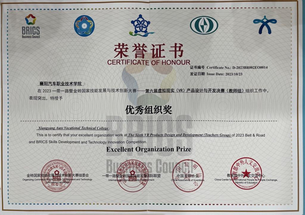 10月20日-23日,2023一带一路暨金砖国家技能发展与技术创新大赛第六届虚拟现实(VR)产品设计与开发决赛在重庆科创职业学院举行。经过职业能力测试、实操比赛和技术答辩等三个环节的激烈角逐,我校教师唐金琴荣获教师组二等奖,同时我校获得优秀组织奖。