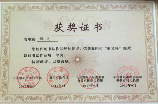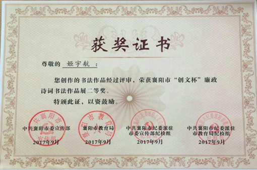 (通讯员:沈晨)9月28日上午,市直宣传、教育系统在市展览馆举办的襄阳市“创文杯”廉政诗词书法作品开展。我校书法协会会员汽车应用学院谭化同学荣获一等奖,姬宇航同学荣获二等奖。