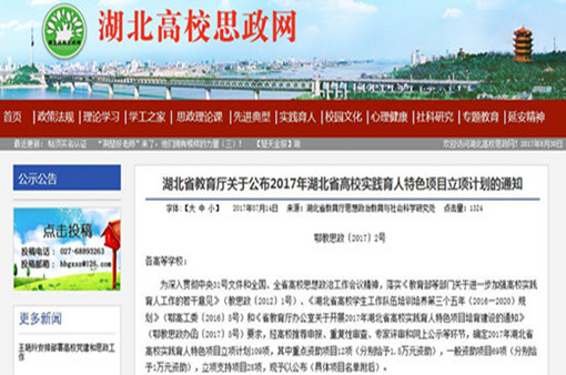 高校实践育人特色项目培育建设工作的启动旨在切实促进高校学生工作队伍职业化、专业化、专家化,推动高校实践育人工作科学化、规范化、系统化。本次立项经高校推荐申报、重复性审查、专家评审和网上公示等环节,确定2017年湖北省高校实践育人特色项目立项计划109项。