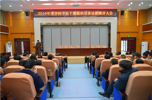 (通讯员:石慧)12月18日,我院首次开展的中层干部履职尽责述职测评大会在学院学术报告厅举行,学院领导班子成员、中层以上干部、教代会全体代表和副高以上职称教师参加了测评大会。会议由学院副院长张建成主持,纪委书记郑建宣读《关于开展2016年度中层干部履职尽责考评工作的通知》。