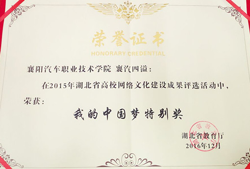 (通讯员:杨襄渝、韩旭)近日,省教育厅公布了2015年度湖北省高校校园文化建设、网络文化建设优秀成果评选结果。我院“襄汽四溢”荣获2015年全省高校网络文化建设优秀成果“我的中国梦”特别奖,汽车应用系辅导员陈磊评为“优秀指导老师”。