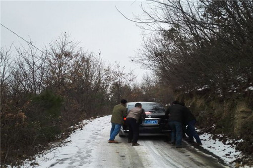 在村干部的引导下,冒着严寒,满载着米、面和食用油等慰问品的小车在崎岖的山路上缓慢前行。由于前两天刚下过雪,山高路结冰,车子直打滑,领导干部们就下车顶着刺骨的寒风踩着泥雪推车前行,就这样边走边推克服困难,把粮油米面一一送到村民家里。
